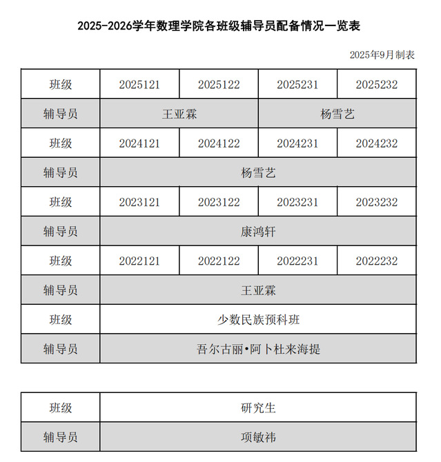 2025-2026学年数理学院各班级辅导员配备情况一览表
